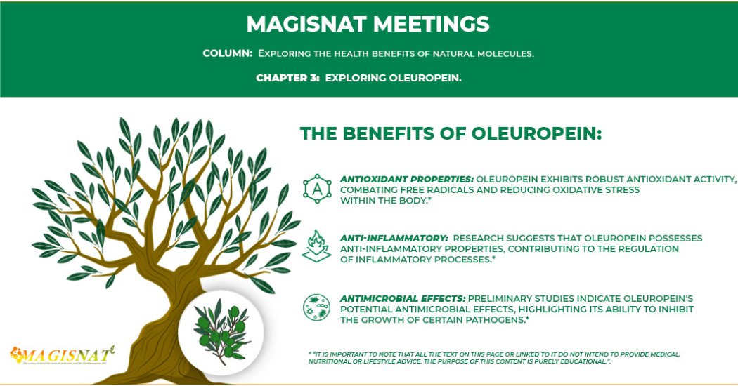 This week, the team of Magisnat presents the third chapter of our column, “Exploring the Health Benefits of Natural Molecules” where they delve into the multifaceted properties of oleuropein. Oleuropein, a phenolic compound is celebrated for its extensive health benefits. As a crucial component of the Mediterranean diet, oleuropein contributes significantly to the health-promoting attributes of olives and olive oil, offering a range of biological effects that include antioxidant, anti-inflammatory, and antimicrobial properties. *