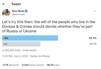 Rather than relying on the results of the fraudulent elections that Russia just held in four regions of Ukraine, Elon’s plan calls for a new round of