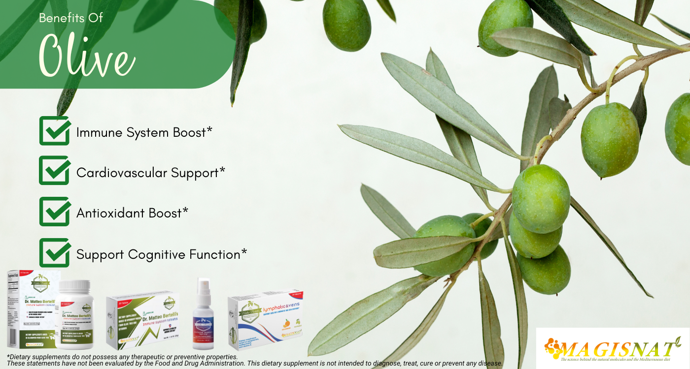 MAGISNAT, a leader in health and wellness solutions, is focusing on the benefits of olive extract within its existing range of dietary supplements. These supplements, including Dr. Matteo Bertelli’s Immune System Spray, Dr. Matteo Bertelli’s Immune System Tablets, Dr. Matteo Bertelli’s Immune System Capsules and Dr. Matteo Bertelli’s Lymphatic and Veins harness the power of olive polyphenols and specific olive components to support a variety of health benefits.*